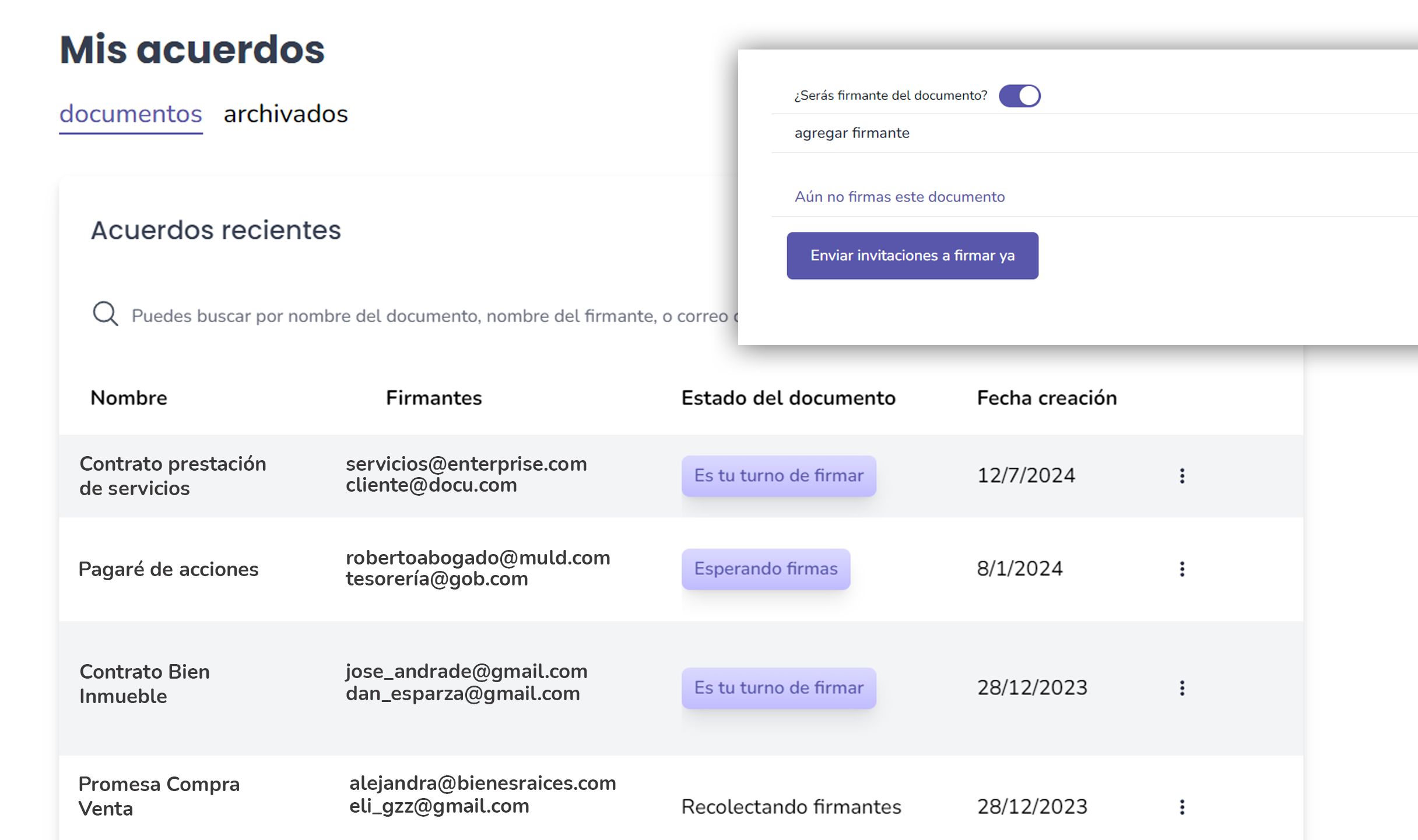 El software integra todo lo necesario para la administración de firmas digitales, incluyendo la creación y gestión de documentos, la capacidad de invitar a terceros a firmar el documento y la visualización en tiempo real de quién ha firmado.